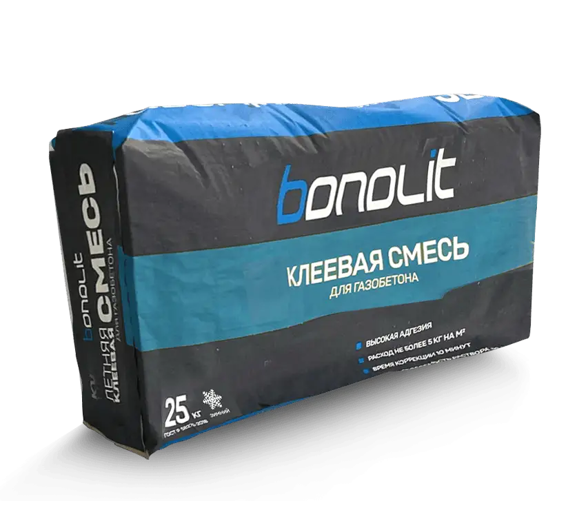 Клеевая смесь для газобетонных блоков BONOLIT — современный строительный состав на основе цемента и песка, дополненный минеральными компонентами и пластифицирующими добавками. Раствор предназначен для выполнения прочной и долговечной кладки с тонким швом.